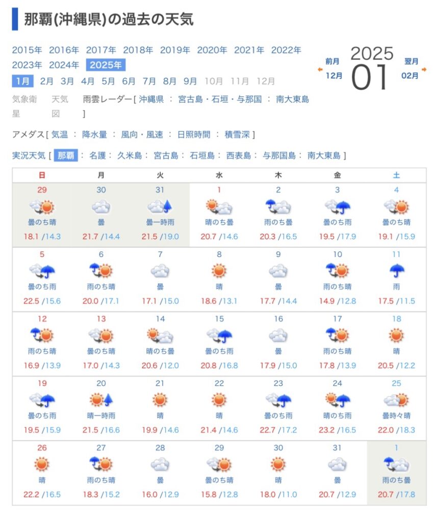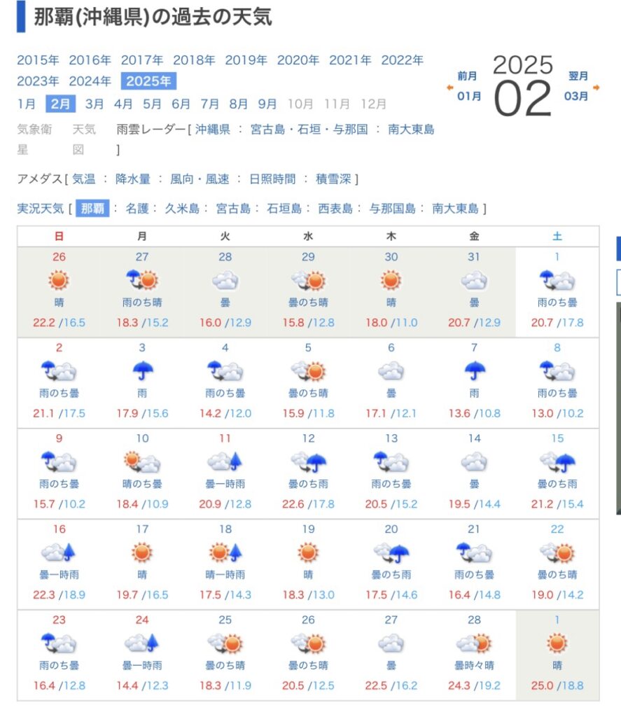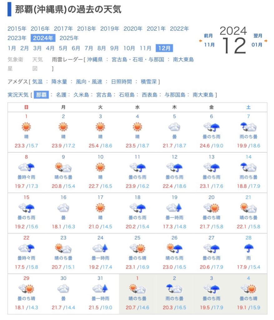 去年2024年12月~2025年1月、2月の実際の天気はこんな感じ。